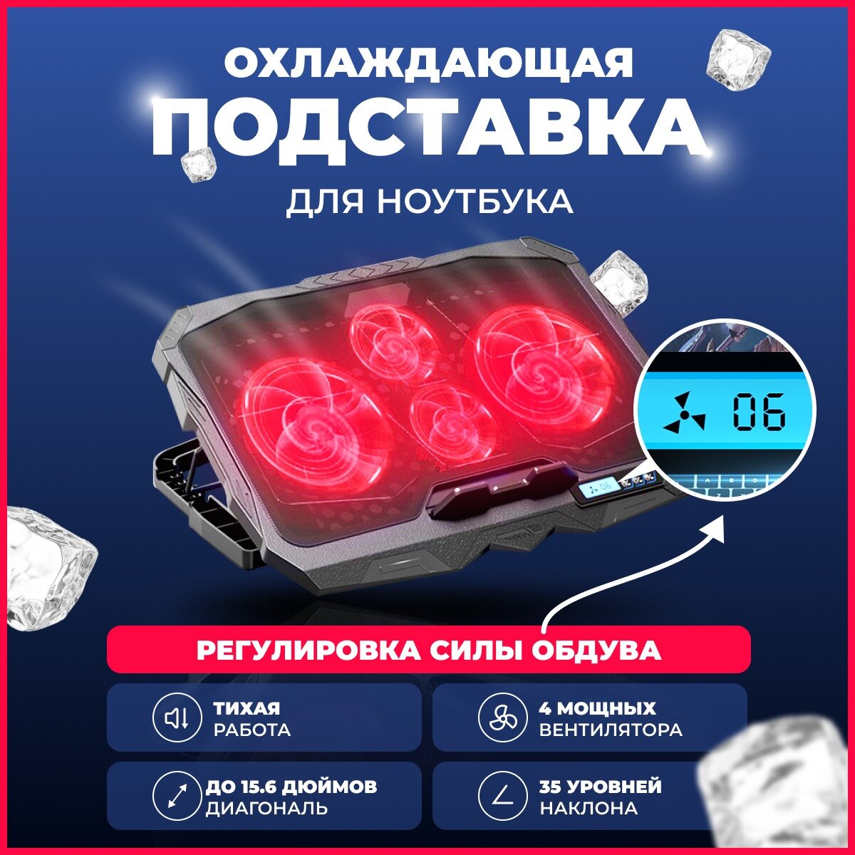 Подставки для ноутбуков Охлаждающая подставка для ноутбука, 4 вентилятора, 2 USB, RGB, регулировка наклона и оборотов