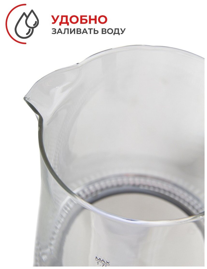 Лучшие цены. Объем: 1,7 л Мощность: 2200 Вт Материал корпуса: термостойкое стекло Индикатор уровня воды Фильтр от накипи Полностью съемная крышка без механизма Внутренняя LED - подсветка Дисковый нагревательный элемент Автоматическое отключение при закипании Защита от включения без воды Съемная крышка Внутренняя часть крышки из нержавеющей стали Вращение на подставке 360° Длина шнура: 75 см Параметры питания: 220-240 В ~ 50 Гц. Магазины в вашем городе.