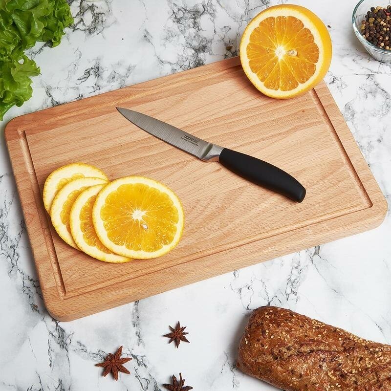 Лучшие цены. Нож кухонный Appetite Ультра для нарезки лезвие 12.5 см (HA01-4). Нож Ультра предназначен для нарезки овощей, фруктов, сыра, небольших буханок, хлеба, булочек, масла и других продуктов. Лезвия долгое время остаются острыми и не требуют частого затачивания. Этот прибор предназначен для резки продуктов с минимальным усилием, по этой причине его нужно использовать с осторожностью. Нож Ультра изготовлен из нержавеющей стали. Имеет удобную пластиковую ручку. Длина лезвия 12.5 см. Магазины в вашем городе.