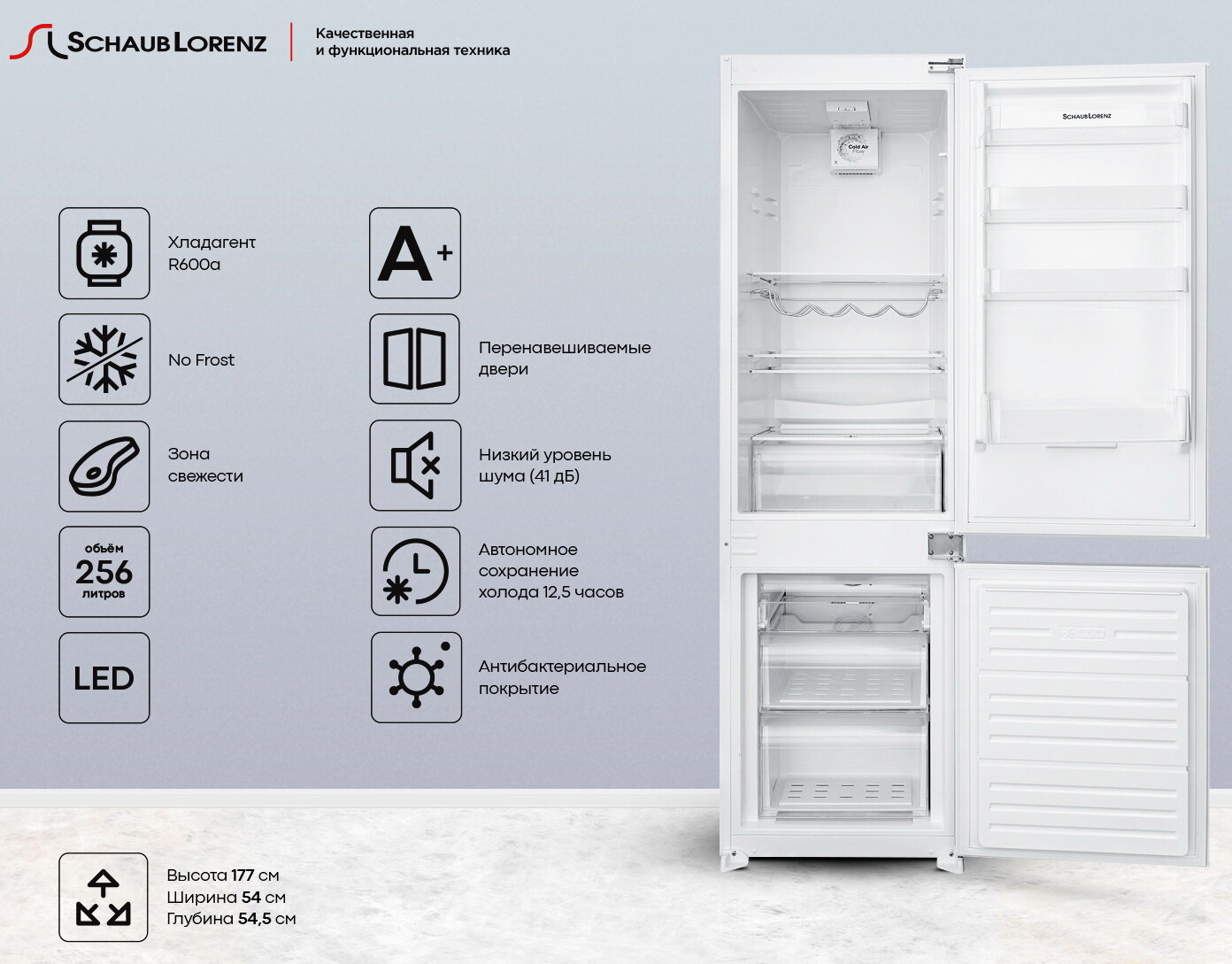 Холодильник двухкамерный встраиваемый Schaub Lorenz SLU E235W6, система разморозки No Frost, перенавешиваемые двери, высота 1770 мм., производство Турция 155 533 ₽ Подробнее