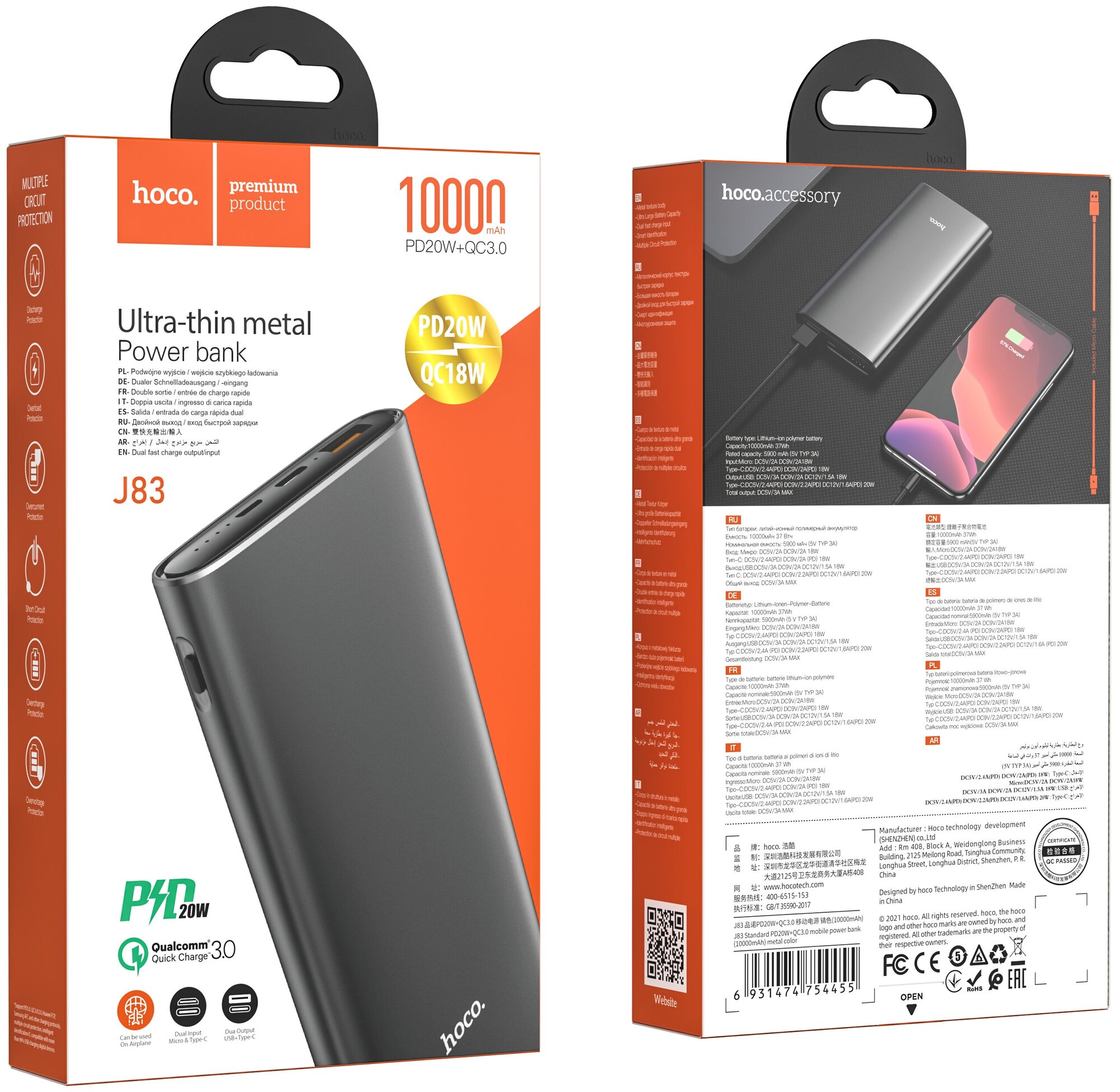 Powerbank Портативный аккумулятор HOCO J83 Standard, 20W, 3A, 10000 мА⋅ч, корпус алюминий, черный