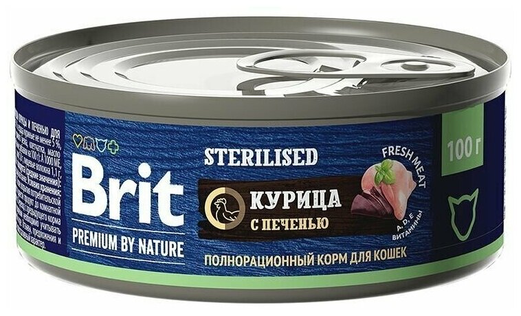 Корм Brit Premium By Nature Sterilised (консерв.) для стерилизованных кошек, курица с печенью, 100 г x 12 шт