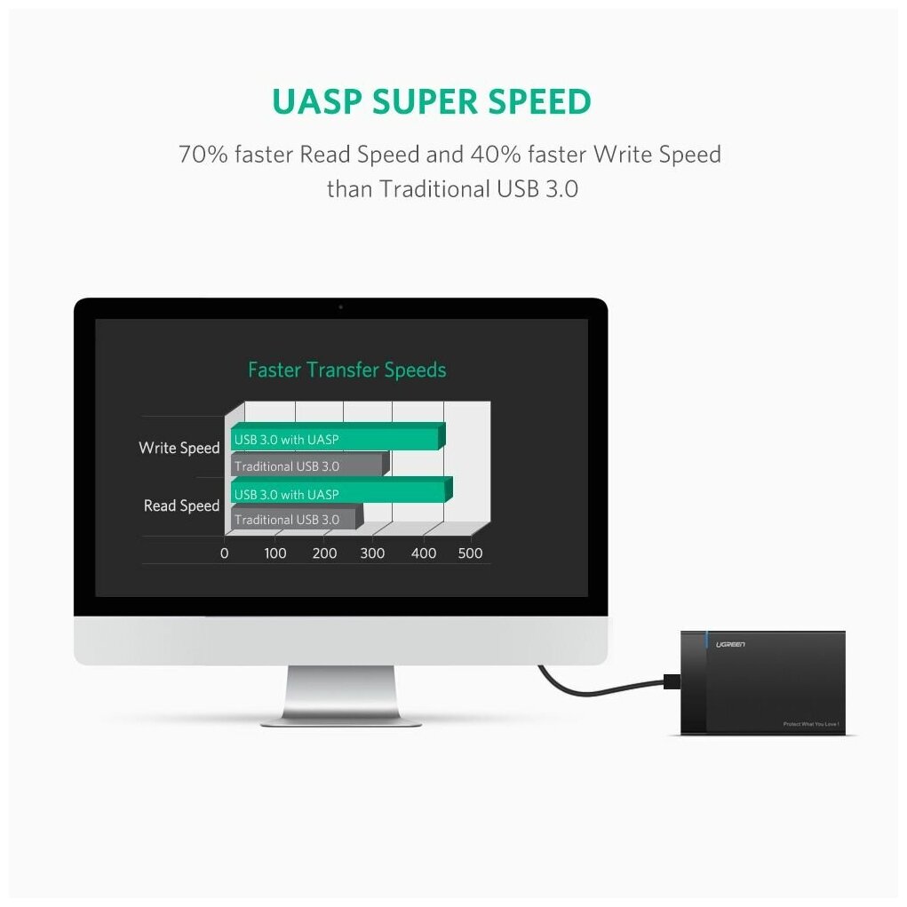 Бокс для накопителей UGREEN US221-30848; вход: USB-A 3.0; выход: 2.5" SATA 3.0; 6 Гбит/с; кабель Micro USB 3.0 to USB-A
