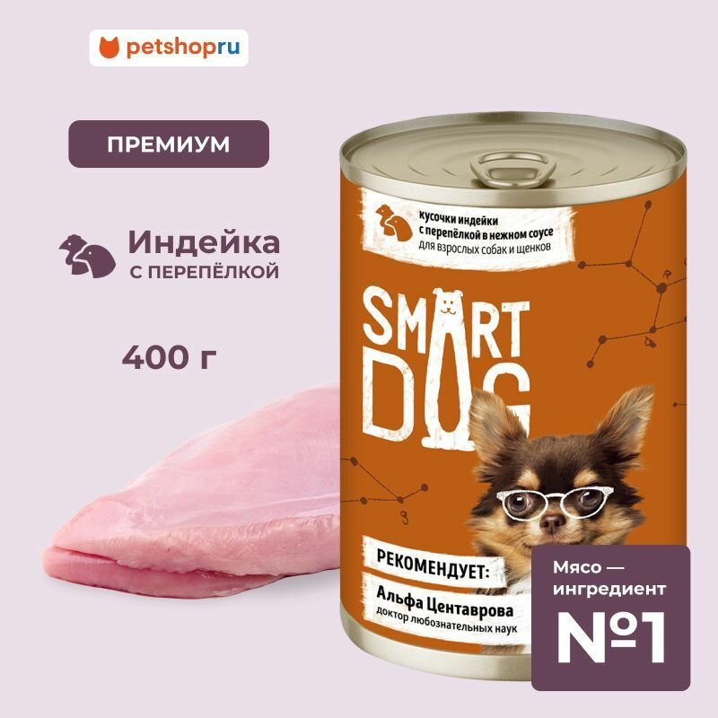 Smart Dog консервы Консервы для взрослых собак и щенков кусочки индейки с перепелкой в нежном соусе 22ел16 43742 0,4 кг 43742 (2 шт)