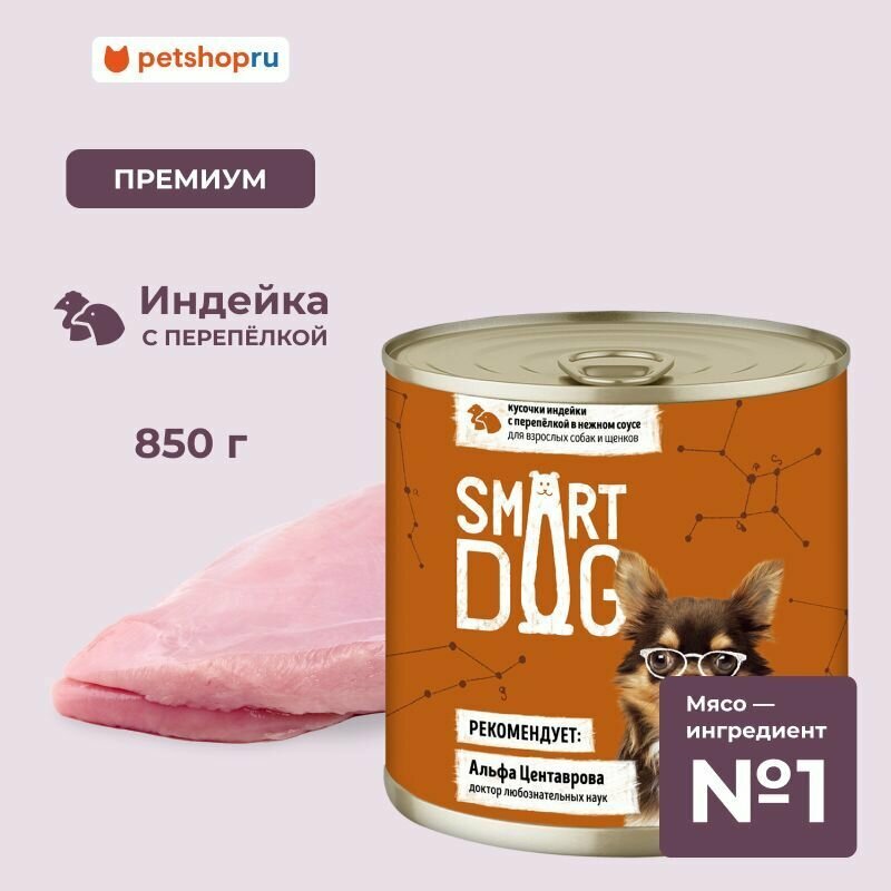 Smart Dog консервы Консервы для взрослых собак и щенков кусочки индейки с перепелкой в нежном соусе 22ел16 43744 0,85 кг 43744 (2 шт)