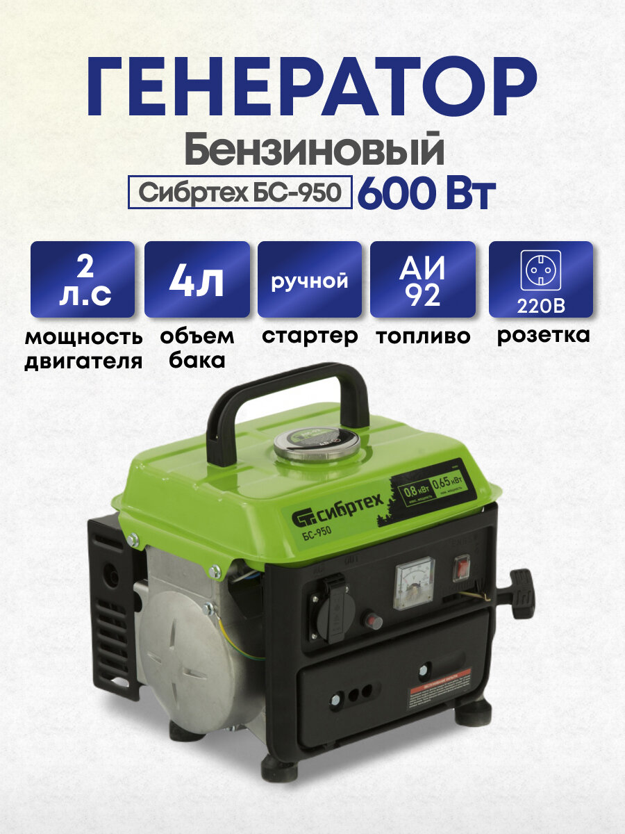 Лучшие цены. Бензиновый генератор Сибртех БС-950 94665 на 230 В, мощностью 0,8 кВТ, с 2-тактным двигателем и ручным стартером, с баком объемом 4 л, отличается небольшими габаритами, что делает его незаменимым на природе, на рыбалке, на даче или в гараже. Мощности 0,8 кВт достаточно для подключения электроинструмента или приборов с небольшим уровнем потребления энергии. На одной заправке генератор способен проработать до 4 часов. ПреимуществаНадежность — корпус из прочного пластика устойчив к механическим повреждениям. Магазины в вашем городе.