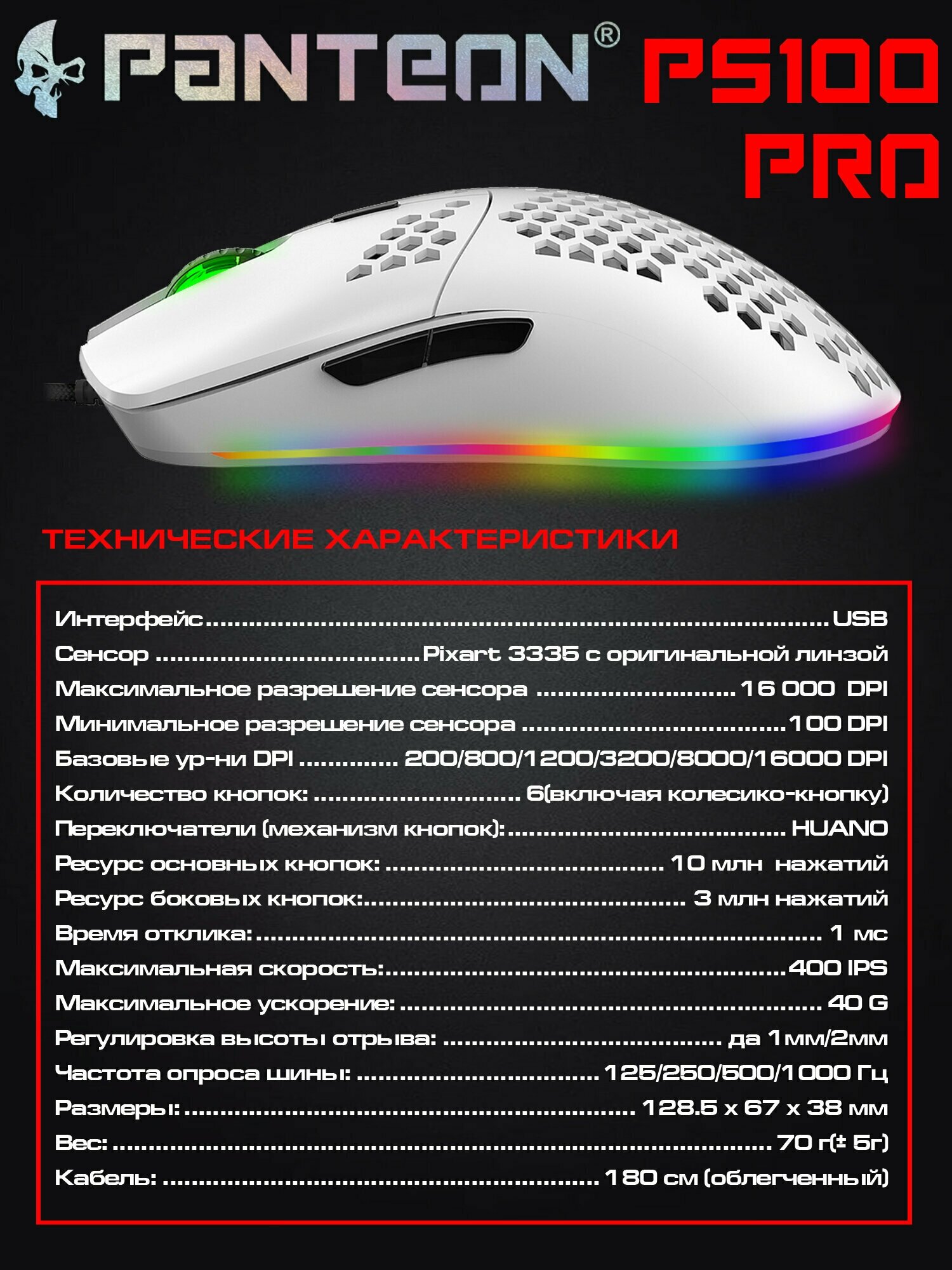 Мышки Игровая мышь для компьютера программируемая с подсветкой LED PANTEON PS100 (PIXART 3327, 220 IPS/30 G, 200-6400 DPI,125-1000 Гц, LED CHROMA LIGHT, вес 70 гр.)