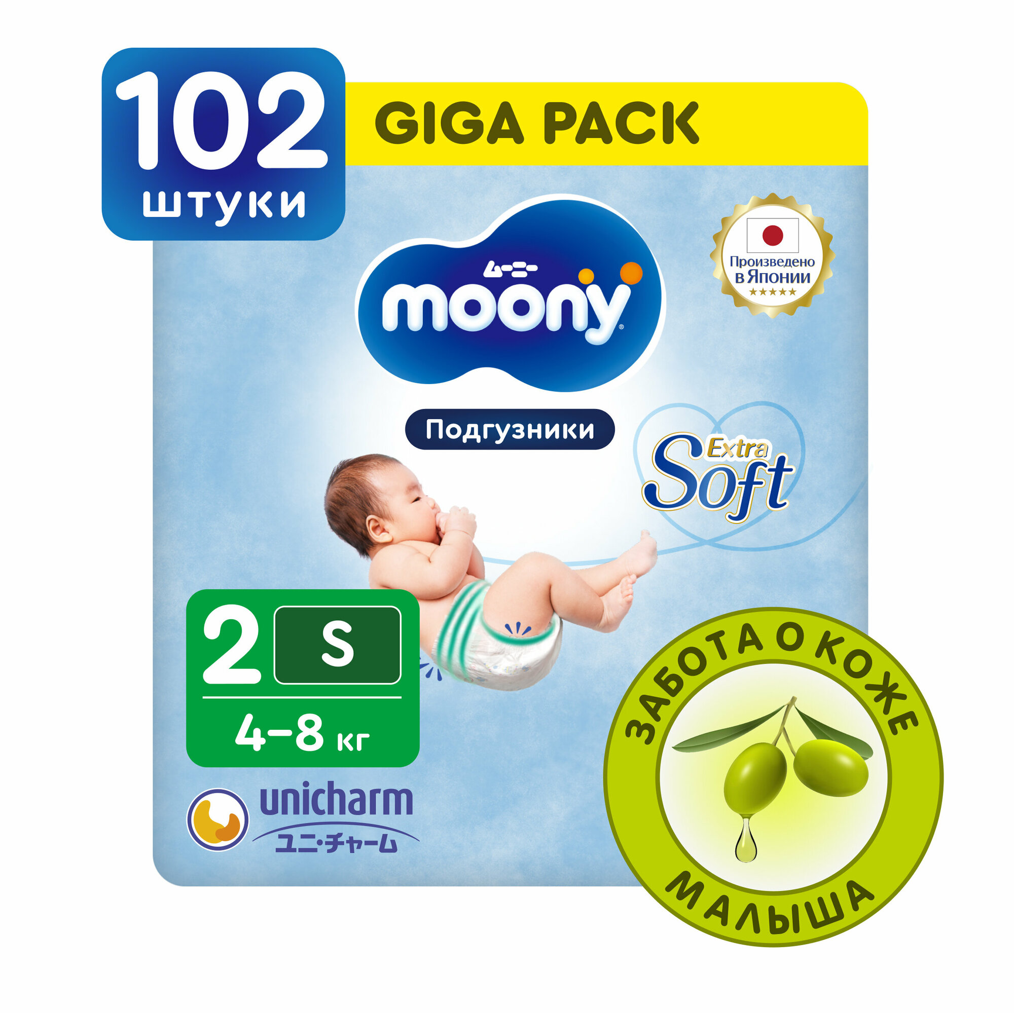 Подгузники (памперсы) Японские подгузники для новорожденных MOONY Extra Soft 2 S 4-8 кг, GIGA 102 шт