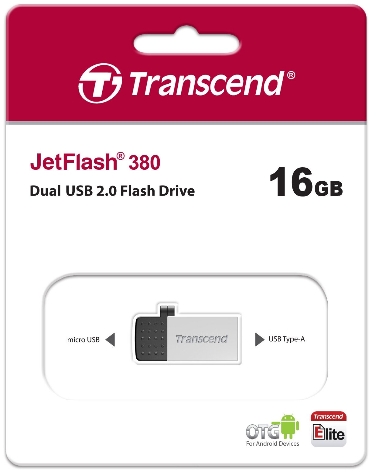 micro-USB + USB 2.0 Flash Drive 16GB Transcend JetFlash 380S, металл, серебро (TS16GJF380S)