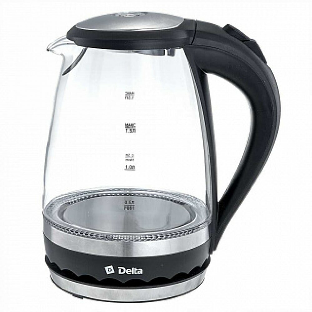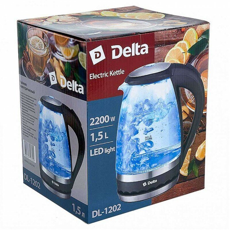 Электрочайник DELTA DL-1202, корпус из жаропр. стекла, черный: 2200 Вт, объем 1,5 литра