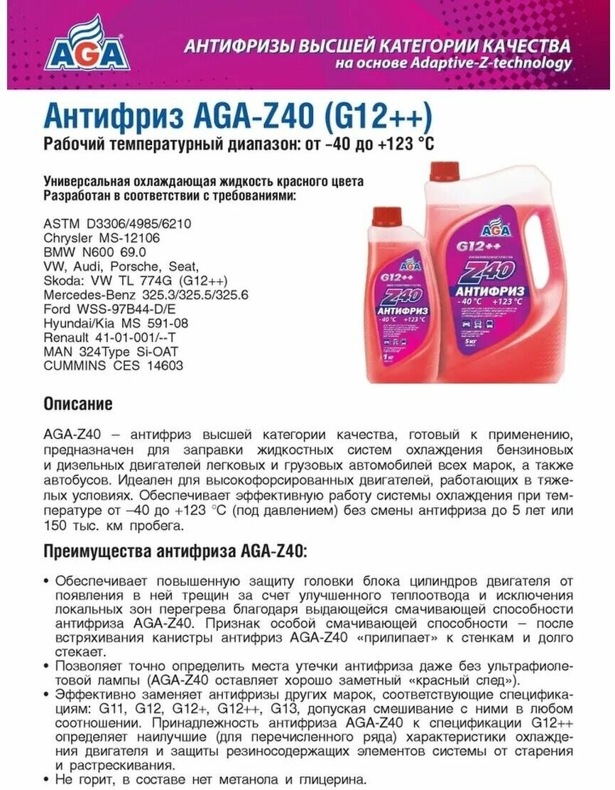 Лучшие цены. Охлаждающая жидкость очень важна для любого автомобиля. Если она выбрана правильно, то двигатель не станет перегреваться из-за чрезмерных нагрузок. Для того чтобы защитить свой автомобиль от перегрева, отличным помощником будет антифриз AGA Z40 Red - 40! Антифриз это специальная охлаждающая жидкость, состоящая из спирта (как правило, этиленгликоля), дистиллированной воды и пакета присадок. Магазины в вашем городе.