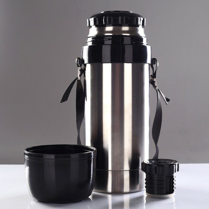 Лучшие цены. Термос универсальный "Дорожный" 1с672, 1.5 л, 49 °С, 24 ч, на ремне. Термосы ТМ «Амет» изготавливают из коррозионно-стойкой стали. Этот материал переносит лёгкие удары и не боится вибраций. Изделия имеют двойную металлическую колбу с глубоким вакуумом, поэтому сохраняют тепло на долгое время. Используйте термос универсальный "Дорожный" 1с672, 1.5 л, 49 °С, 24 ч, на ремне дома, на даче, берите с собой на работу, рыбалку и охоту, в походы и путешествия. (1303051). Магазины в вашем городе.