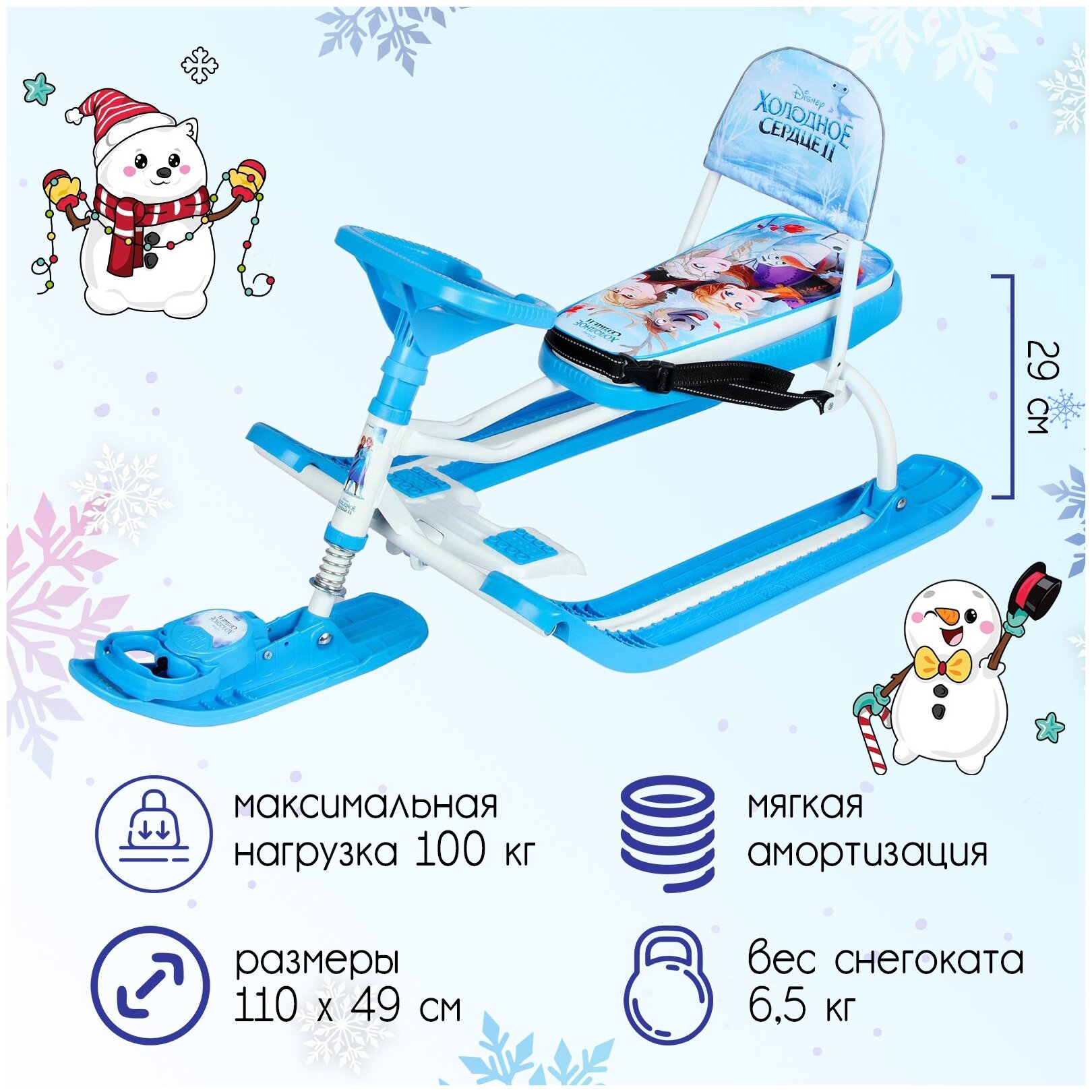 Лучшие цены. Снегокат предназначен для перевозки детей от 3 лет по плотному снегу или льду и для катания с горок. Имеет сварную конструкцию из стальных труб, пластиковых элементов и мягкое сиденье, обтянутое искусственной кожей с рисунком. Буксировочный трос с автоматической намоткой. Усиленный тормоз эффективен на обледенелой поверхности. Спинка съёмная складная. Размеры и масса: * длина, мм: 1100; * ширина, мм: 490; * высота/с поднятой спинкой, мм: 420/450; * высота по сиденью, мм: 290; * ширина колеи, мм: 370. Магазины в вашем городе.