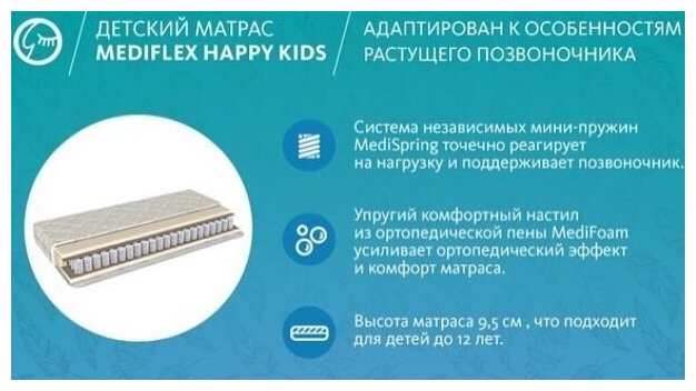 Лучшие цены. Матрас Mediflex Kids Happy 200х80 см В жизни ребенка сон занимает очень важное место, и крайне необходимо создать для малыша правильные условия сна. От правильно подобранного матраса зависит, прежде всего, правильное распределение нагрузки на позвоночник, правильное его развитие и, конечно, правильная осанка малыша, и как результат - здоровье ребенка в целом! Особенности: Упругий комфортный настил из ортопедической пены MediFoam и натурального льна Усиливает поддержку детского позвоночника и комфорт. Магазины в вашем городе.