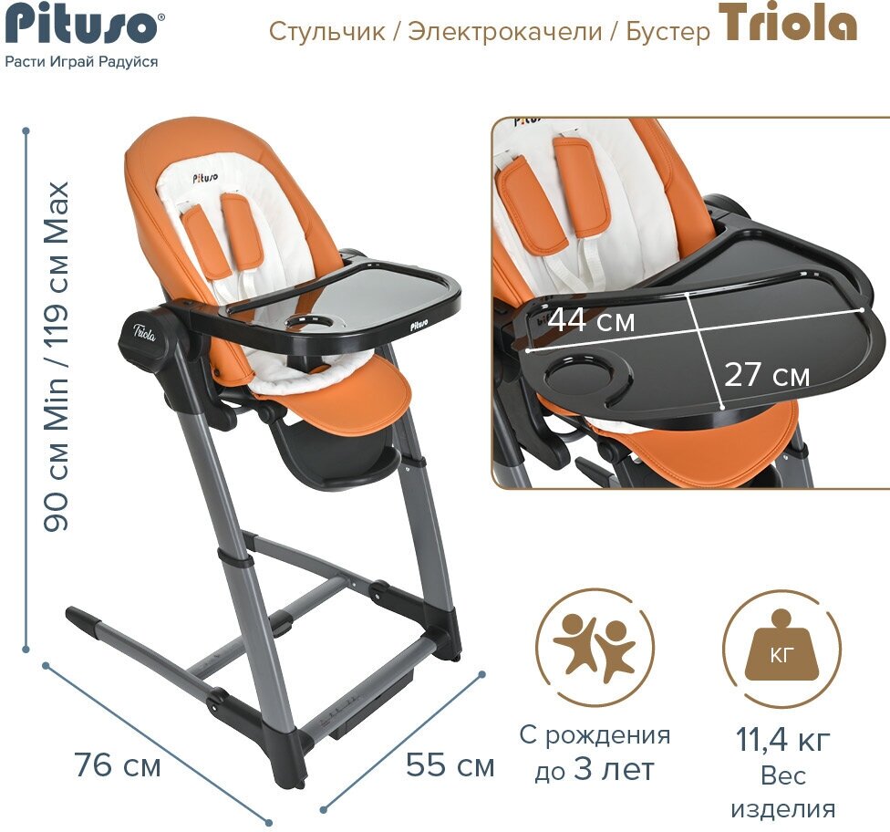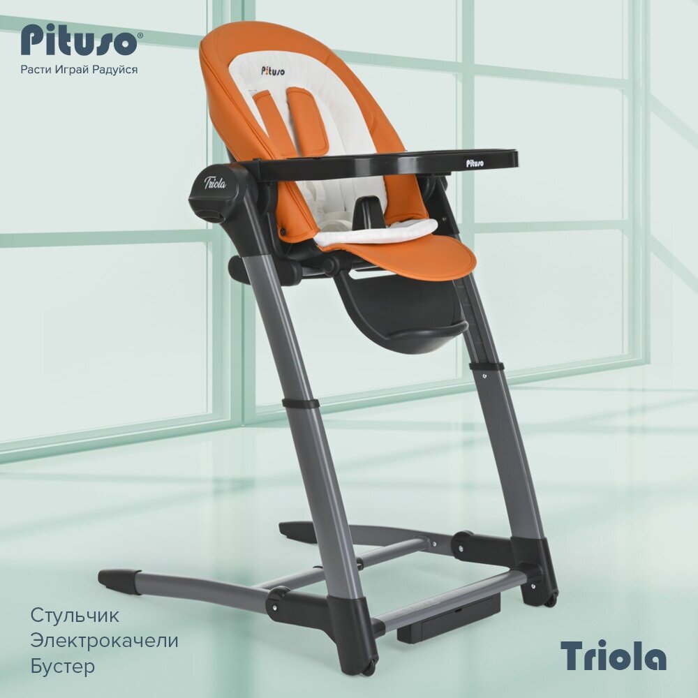 Лучшие цены. Pituso Triola — уникальный стульчик для кормления и электрокачели. В зависимости от возраста используется следующим образом: От 6 месяцев до 1 года — электрокачели От 0 до 3 лет — стульчик для кормления Характеристики: Складная компактная рама Легкомоющийся съемный чехол из экокожи Мягкий комфортный вкладыш Регулируемая спинка 7 уровней регулировки по высоте Регулируемая подставка для ног Стул оснащен колесами, обеспечивающими легкий ход 2 положения регулировки столешницы с подносом 5-ти точечный ремень. Магазины в вашем городе.