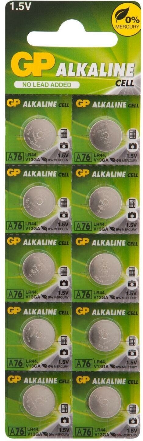 Лучшие цены. Марганцево-цинковые пуговичные батарейки A76/LR 44 - 10 шт GP A76FRA-2C10 – элемент питания щелочного типа. Плоская форма и компактные размеры позволяют использовать данный тип как универсальный для портативных устройств: электронных часов, калькуляторов, слуховых аппаратов, детских игрушек. В батарейке используется марганцево-цинковый электролит, благодаря чему при низком внутреннем сопротивлении и стабильном малом разряде срок хранения элементов питания увеличивается до 3 лет. Магазины в вашем городе.