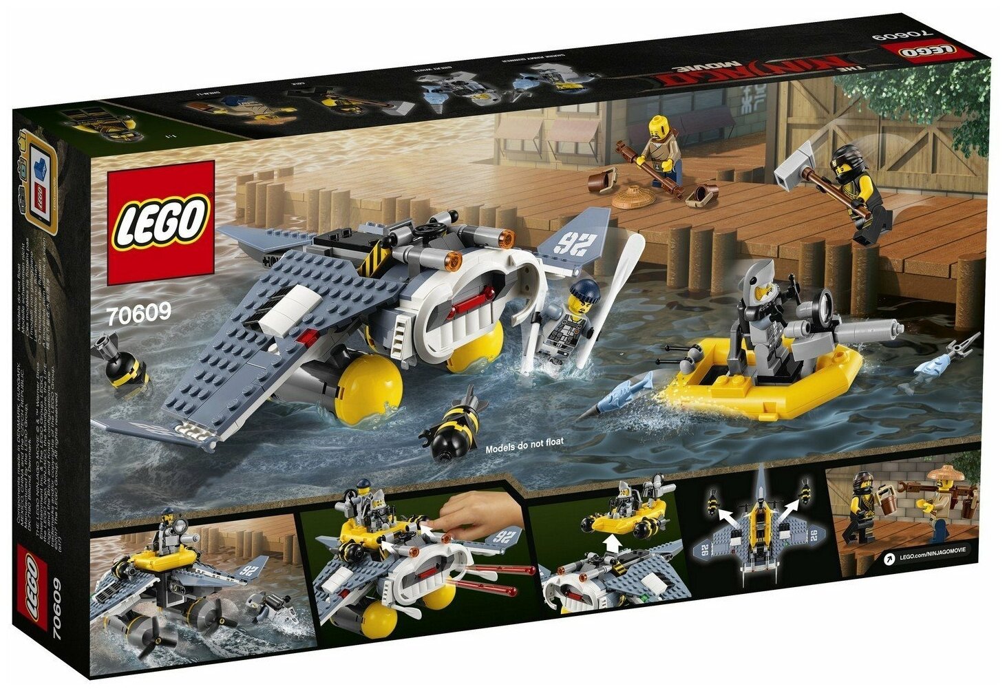 Лучшие цены. Конструктор LEGO The Ninjago Movie 70609 Бомбардировщик Морской дьявол Набор предлагает нам воссоздать сцену нападения акульей армии на город. Конструктор состоит из 341 детали и включает 4 минифигурки. Из деталей набора мы сможем собрать самолет-бомбардировщик, называющийся «Морской дьявол», с баками для посадки на воду и взлета с нее. Закрылки самолета подвижны, на носу установлено два пружинных шутера, вместо кабины пилота бойцы армии акул используют шлюпку, которая может быть снята с самолета и тоже. Магазины в вашем городе.