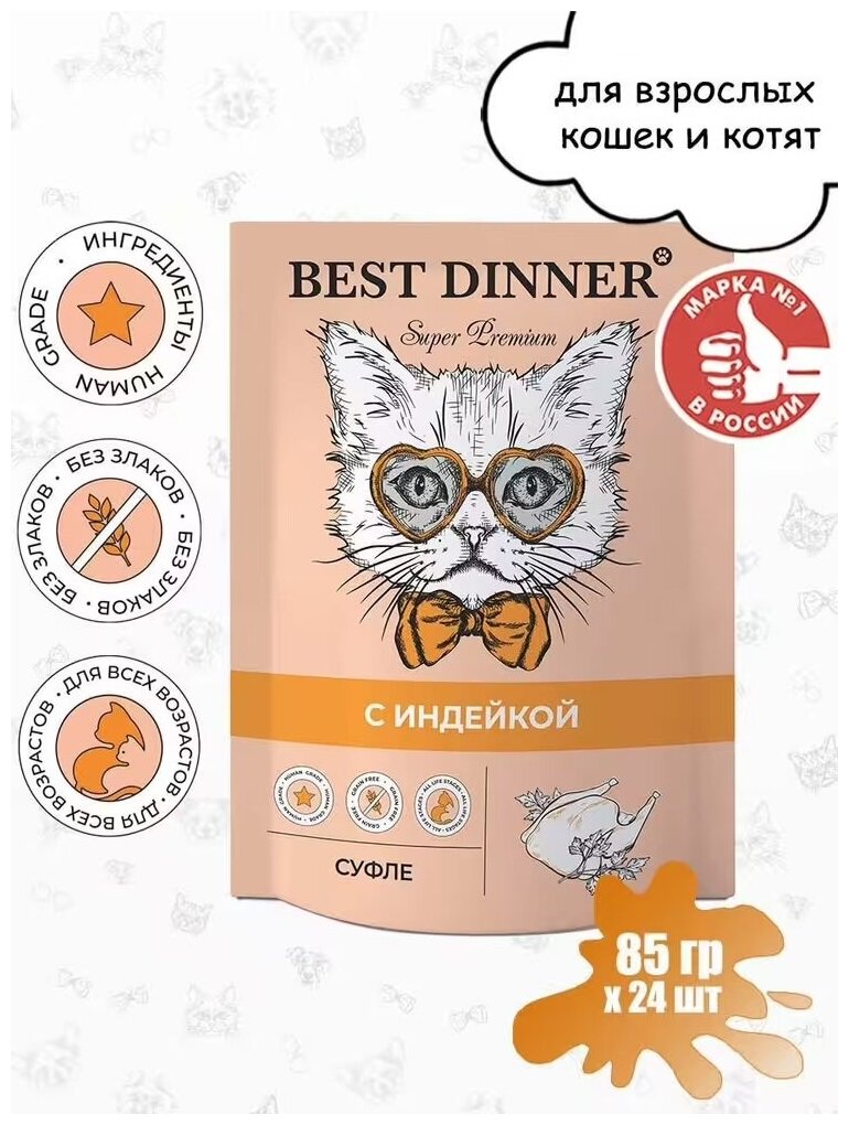 Влажный корм для кошек Best Dinner для кошек и котят с 6 месяца мясные деликатесы суфле с индейкой пауч, 85 г. 24 шт.