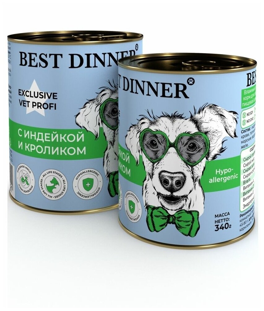 Best Dinner Бест Диннер консервы для собак Exclusive Hypoallergenic, индейка, кролик, 340 гр. по 6 шт.