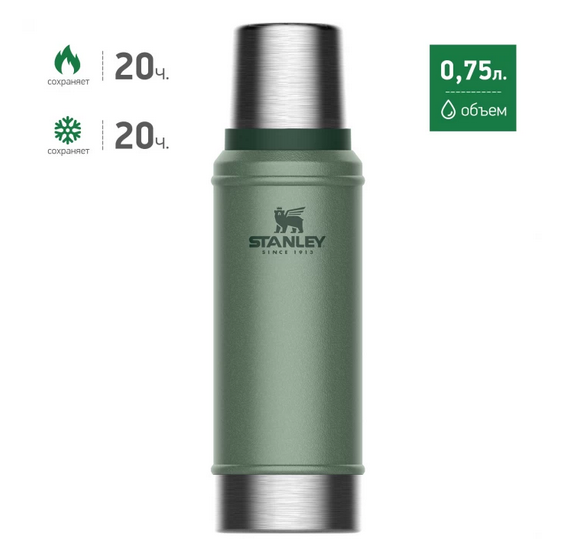 Лучшие цены. Небольшой термос STANLEY Classic объёмом 0.75 л - это горячая чашка кофе, которую можно брать с собой на прогулку или в дорогу. Компактный и стильный, он легко поместится даже в небольшую сумку или карман рюкзака. Матовое порошковое покрытие внешней части корпуса обладает антискользящими свойствами, а также успешно противостоит различным загрязнениям и мелким механическим повреждениям. Магазины в вашем городе.