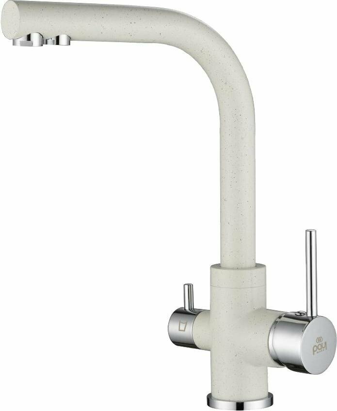 Смеситель для кухни Paulmark ESSEN, подключение к фильтру питьевой воды с отдельным каналом и выпуском, высокий поворотный излив, латунь, на мойку, белый с вкраплениями, Es213011-331