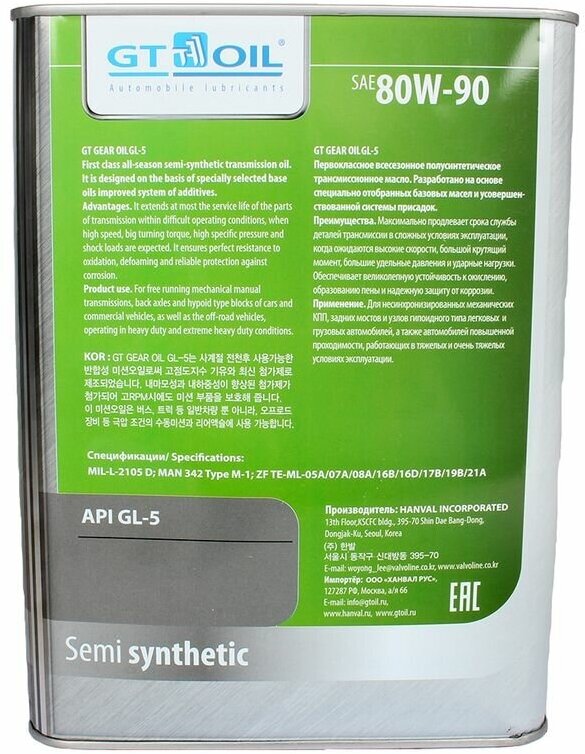 Масло трансмиссионное полусинтетическое GT Gear Oil, SAE 80W-90, API GL-5, 4 л GT OIL 8809059407837 | цена за 1 шт
