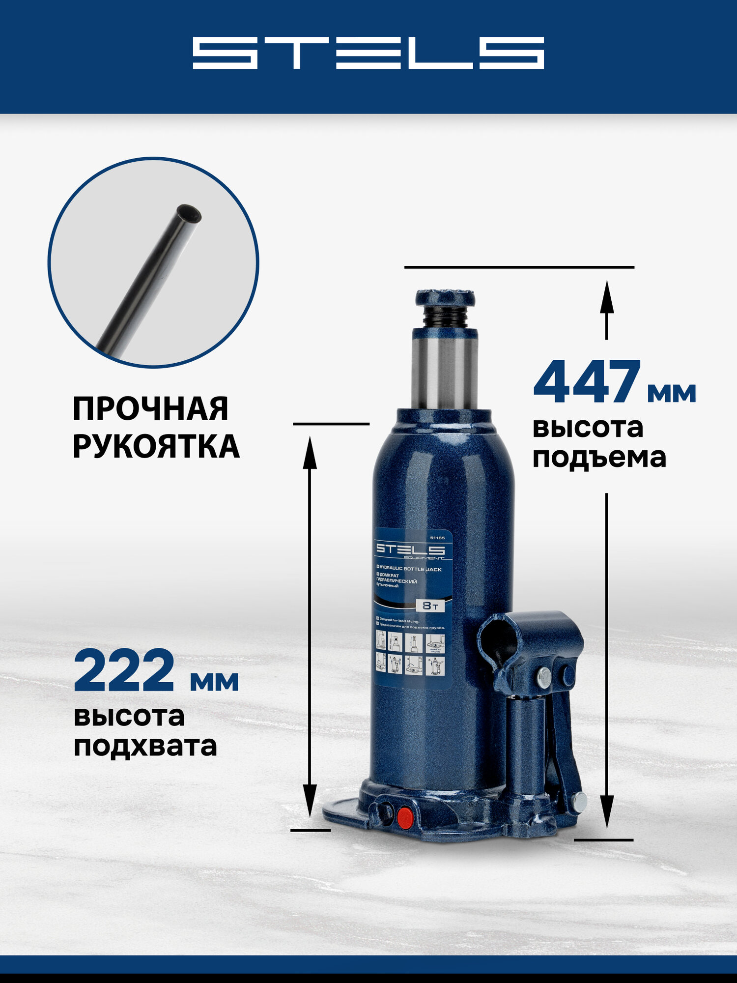 Stels Домкрат гидравлический бутылочный, 8 т, h подъема 222-447 мм// Stels 2 710 ₽ Подробнее