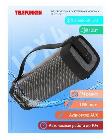 Лучшие цены. Портативная колонка TELEFUNKEN TF-PS1241B серый 12W 1.0 BT/USB 1500mAh (TF-PS1241B(карбон)). Портативная колонка Telefunken TF-PS1241B представляет собой решение, с помощью которого вы сможете наслаждаться музыкой где бы ни оказались. Модель выполнена в легком и прочном корпусе с защитой от брызг по стандарту IPX4, что позволит использовать устройство даже под открытым небом. Кроме того, колонка отличается стильным и практичным дизайном, который легко дополнит собой практически любой интерьер. Магазины в вашем городе.