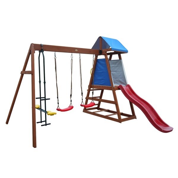 Лучшие цены. Детская игровая площадка DFC серии PLayWood — полноценный мини-городок для активного досуга детей дошкольного возраста. Рекомендуется детям с 3 лет. Центральная часть комплекса представлена небольшим домиком - башней под легкой тканевой крышей. Боковые мягкие стенки служат для защиты от ветра и дождя. Ткань водонепроницаемая. Горка с волной снабжена боковыми бортиками, обеспечивающими безопасность малышей. Дополнительными элементами для развлечений служат различные качели: двойные и одиночные. Магазины в вашем городе.