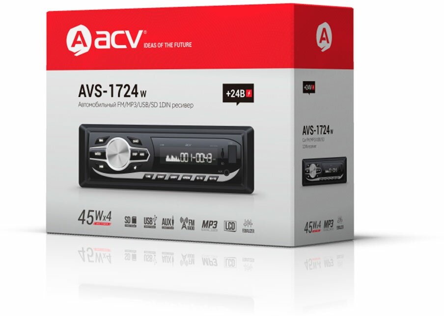 Лучшие цены. Модель AVS-1724W Бренд ACV PartNumber/Артикул Производителя 31046 Типоразмер 1 din Количество каналов 4 Максимальная выходная мощность 45 Тип дисплея монохромный Число предустановок FM 18 Цвет подсветки клавиш белый Аудиовход на передней панели ДА USB-порт фронтальный Основной тип карт памяти SD Цвет основной черный Мощность 4x45Вт Тип карт памяти SD Цвет подсветки клавиш магнитолы белый Цвет черный Питание 24 Длина упаковки (ед) 0.22 Ширина упаковки (ед) 0.08 Высота упаковки (ед) 0.17 Габариты упаковки (ед). Магазины в вашем городе.