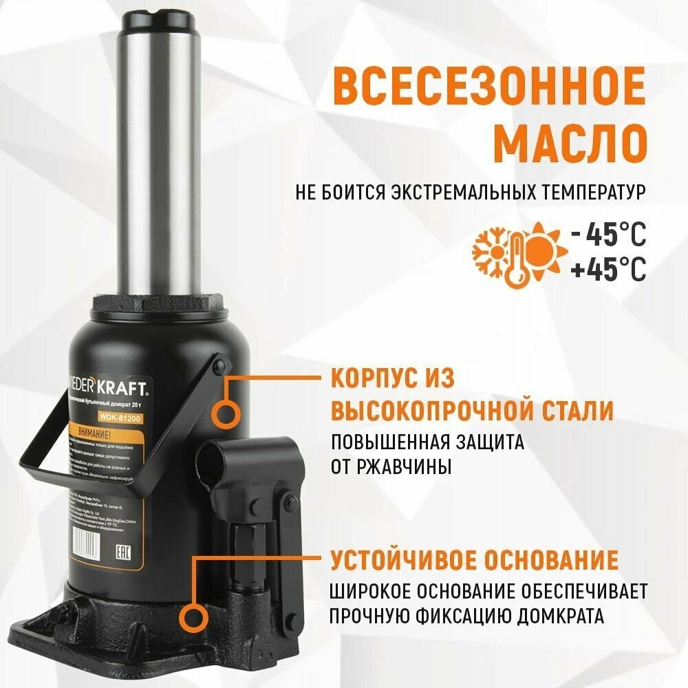 Лучшие цены. Не секрет, что машина давно уже перестала восприниматься как просто средство передвижения, и водители покупают всё лучшее для своих железных коней. Домкрат бутылочный WIEDERKRAFT WDK-81200, гидравлический, 20 т, 242-392 мм — идеальный выбор, если вы ставите целью и улучшение технических характеристик, и поддержание внешнего вида автомобиля. Магазины в вашем городе.