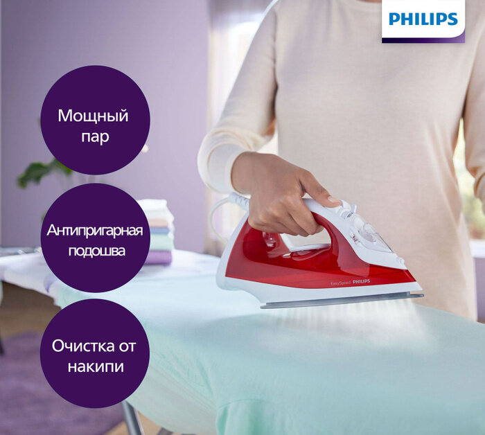 Лучшие цены. Паровой утюг GC1742/40 EasySpeed Просто и эффективноУтюг EasySpeed обеспечивает простое и эффективное глажение: большое количество пара разглаживает жесткие складки, антипригарная подошва обеспечивает превосходное скольжение на любых тканях, а функция очистки от накипи Calc Clean повышает надежность прибора. Резервуар емкостью 220 мл для длительного глажения Резервуар увеличенного объема (220 мл) позволяет гладить дольше без долива воды. Магазины в вашем городе.
