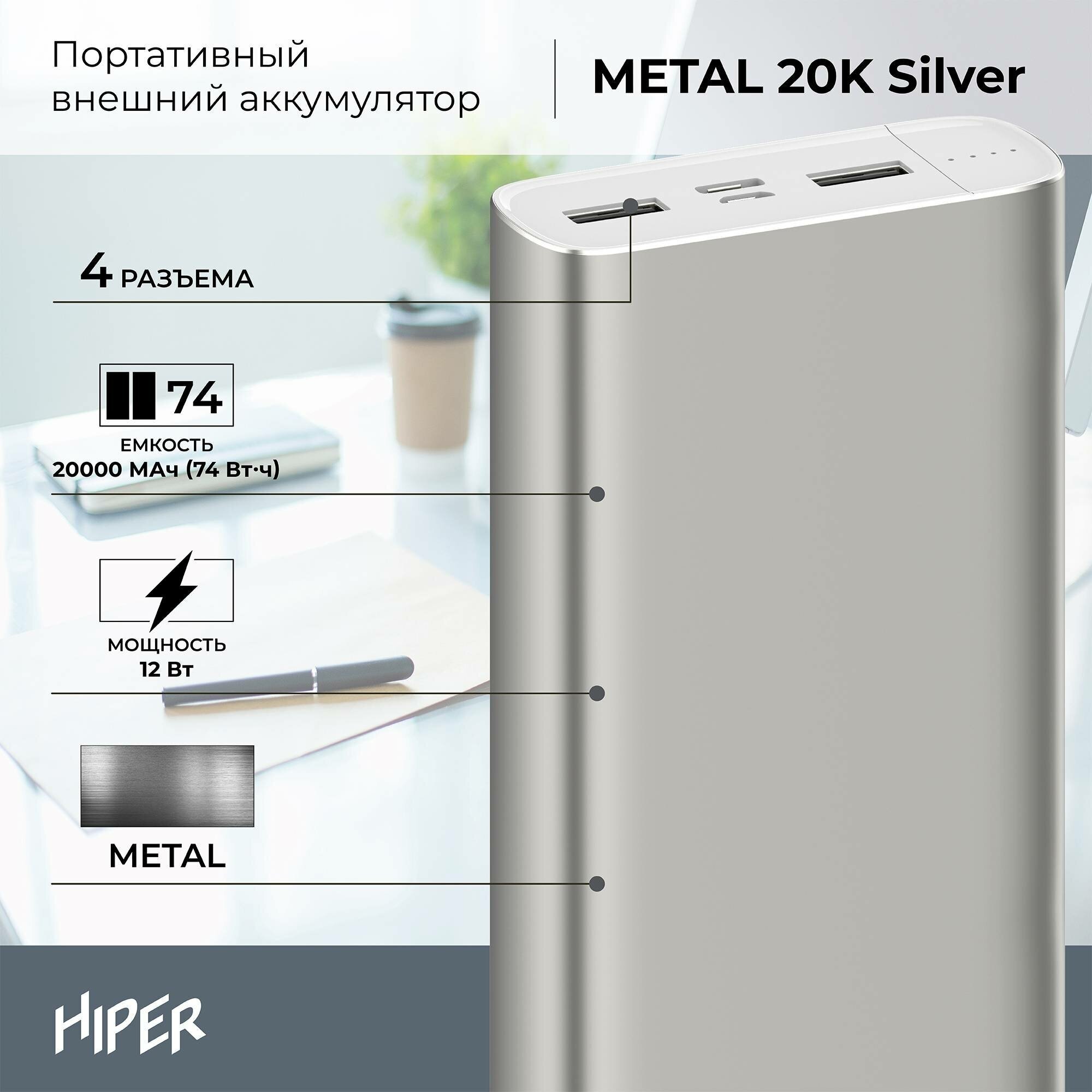 Аккумулятор внешний универсальный HIPER METAL 20K SILVER 20000mAh, Intput: micro-USB, USB-C: Output: 2*USB 5V/2,4A, Max 12W Silver