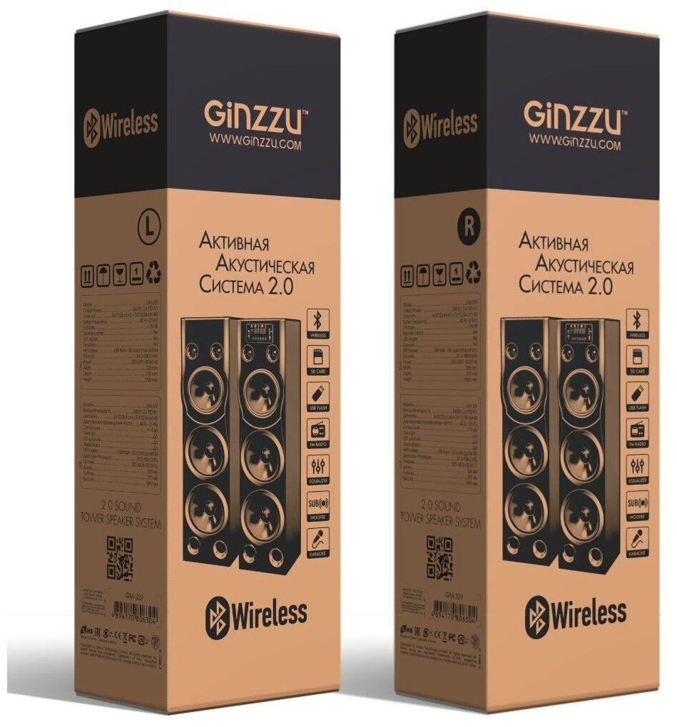 Лучшие цены. Акустическая система Ginzzu GM-329 2.0, 2x120W/BT/USB/SD/FM/AUX/ДУ Напольная акустическая система 2.0 с функцией BLUETOOTH, фм-радио и караоке. выходная мощность (RMS): 2х120 Вт. BLUETOOTH: V4.2 - A2DP, AVRCP. аудио-плеер: SD-card, USB-flash. FM радио: 87,5-108,0 МГц. aудиовход: стерео 2RCA. эквалайзер: POP, ROCK, JAZZ, CLAS, COUN, BASS, PASS. диапазон воспроизводимых частот: 42 Гц - 21 КГц. пульт ДУ: функции STANDBY, MUTE. корпус: MDF + ABS. Магазины в вашем городе.