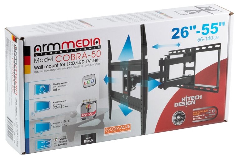 Кронштейн Arm Media COBRA-50 26-55" max 35кг VESA 400x400 поворотно-выдвижной и наклонный 3 600 ₽ Подробнее