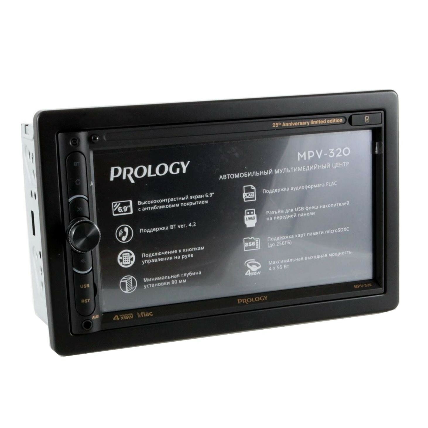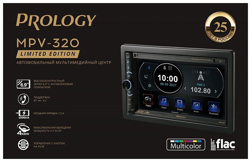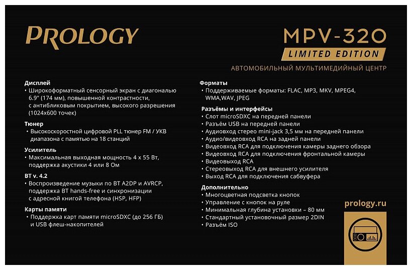 Лучшие цены. Автомобильный мультимедийный центр PROLOGY MPV-320 монтажного размера 2DIN обеспечивает прием радиостанций в диапазоне FM / УКВ, воспроизведение медиафайлов, записанных на карты памяти USB / microSD, передачу звука с внешних источников, а также управление мобильным телефоном через интерфейс Bluetooth (version 4.2). Поддерживается подключение штатных кнопок управления аудиосистемой на руле (интерфейс SWC). особенности модели PROLOGY MPV-320: Широкоформатный сенсорный экран с диагональю 6,9" (174 мм). Магазины в вашем городе.
