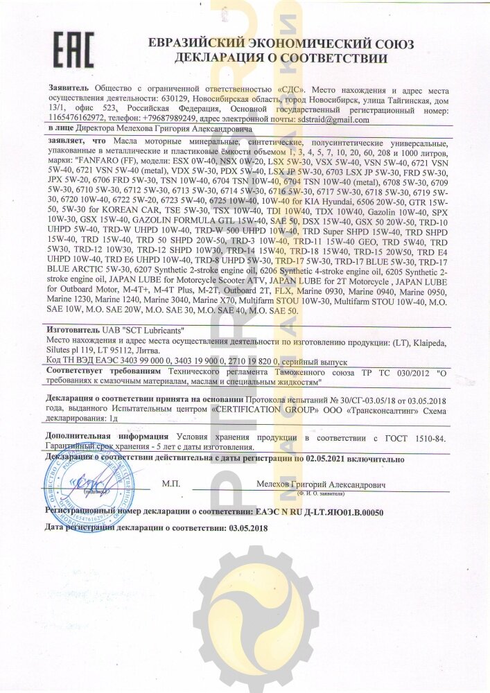 | Соответствие стандартам | ACEA C3; API SN |