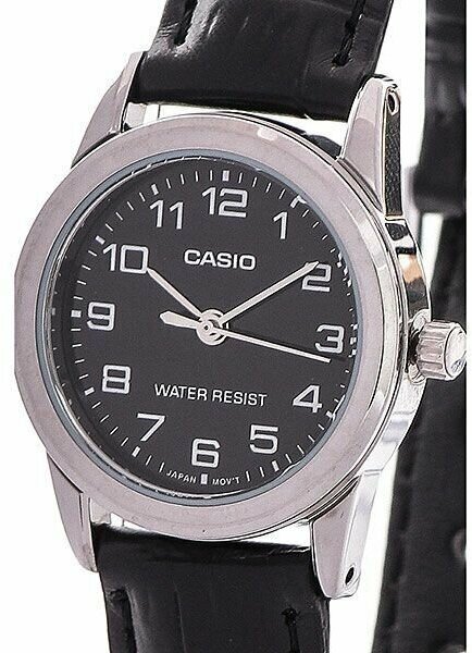 Лучшие цены. Женские наручные часы Casio LTP-V001L-1B , элемент питания в виде батарейки приводит их в действие. Корпус стальной с черным циферблатом и минеральным стеклом, которое еще называется ударопрочным, браслет - кожаный ремешок. Модель Casio LTP-V001L-1B обладает степенью влагостойкости 30 м (3 АТМ), где возможно мыть руки и пройти под легким дождем, для плавания рассмотрите модели с влагостойкостью от 100 м (10 АТМ). Магазины в вашем городе.
