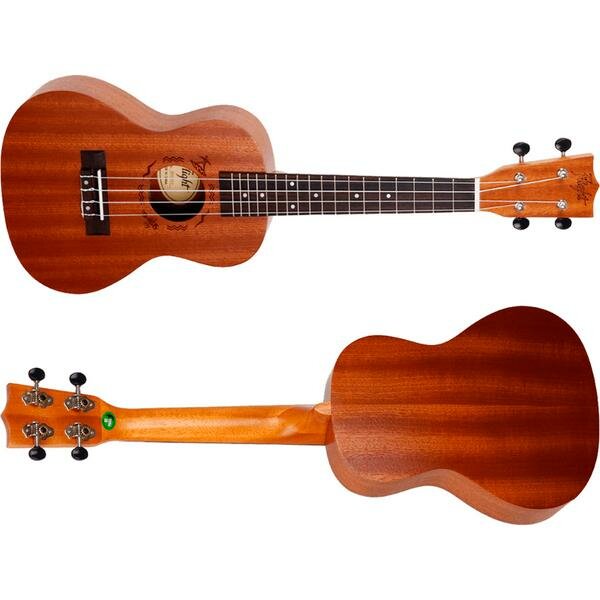 Лучшие цены. Укулеле в корпусе концерт для начинающих. Дека из ламинированного африканского сапеле, гриф из африканского окуме, накладка и бридж из грецкого ореха. 18 ладов с инкрустацией, лазерная окантовка розетки. Верхний и нижний порожки из кости, открытые колки, хромированный стреплок. Мягкий чехол в комплекте. Магазины в вашем городе.
