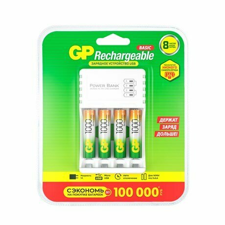 Зарядка аккумуляторных батареек Устройство зарядное USB с аккумулятором GP 1000, 4шт