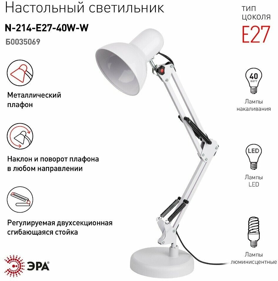 Лампа офисная ЭРА N-214-E27-40W-W, E27, 40 Вт, цвет арматуры: белый, цвет плафона/абажура: белый