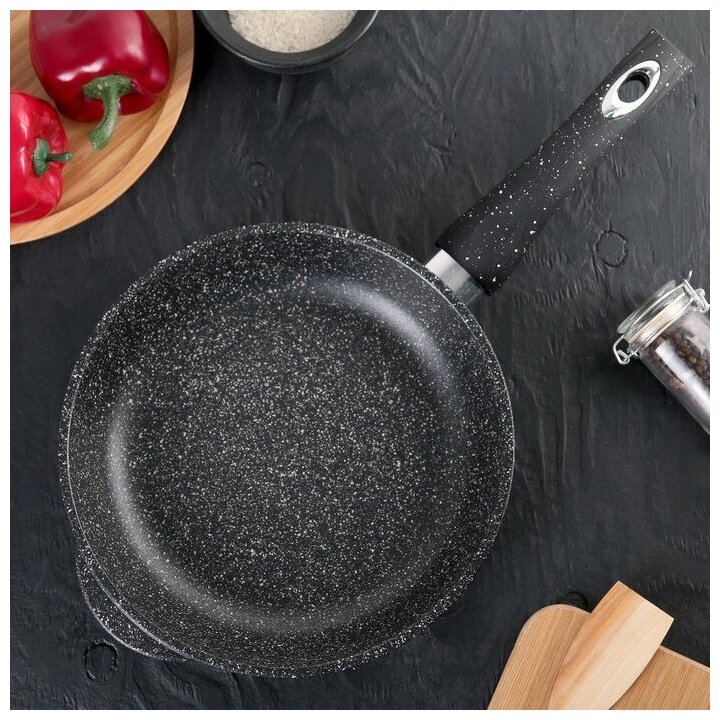 Лучшие цены. «Гранит». Коллекция посуды с улучшенным трехслойным антипригарным покрытием. Дополнительный слой с мраморным эффектом увеличивает износостойкость и создаёт оригинальный оттенок чёрного мрамора. Украсьте вашу кухню как необычными оттенками, так и кулинарными шедеврами. Литая алюминиевая сковорода с антипригарным покрытием подходит для газовых, электрических и стеклокерамических плит. Сковороды со съёмными ручками можно ставить в духовой шкаф. Магазины в вашем городе.