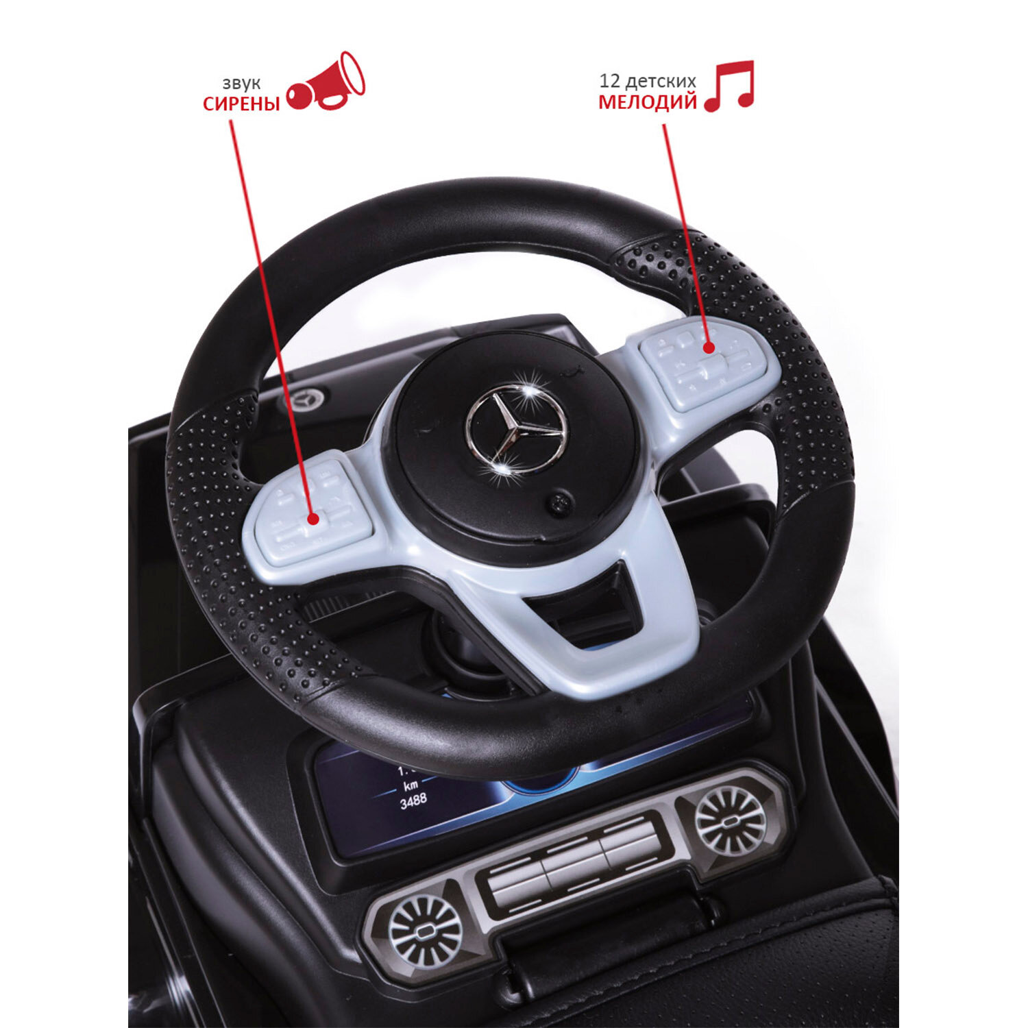 Лучшие цены. Каталка для детей от 1 до 4 лет, выпущенная по лицензии мирового автопроизводителя, точная копия Mercedes Benz G350. Ребенок может толкаться ногами и ехать самостоятельно. Характеристики: Музыкальный руль, звуковые эффекты (руль АА батарейки 2шт , звук клаксона/звук включения) (под сиденье АА батарейки 4шт, заводские мелодии/звук клаксона), батарейки в комплект не входят; Световые эффекты, нет (фары не светятся). Колеса пластик. Место для хранения есть. Сиденье пластик. Магазины в вашем городе.