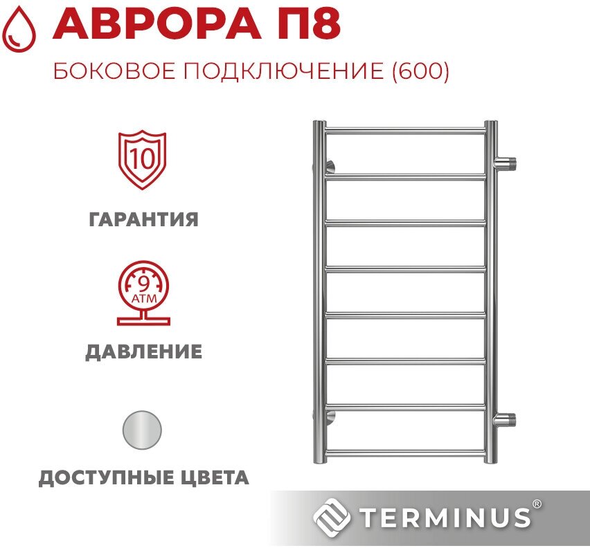 Полотенцесушитель водяной с боковым подключением TERMINUS (Терминус) Аврора П8 400х800 б/п 600 мм, сверхпрочная нержавеющая сталь, , гарантия 10 лет/ Водяной полотенцесушитель для ванной
