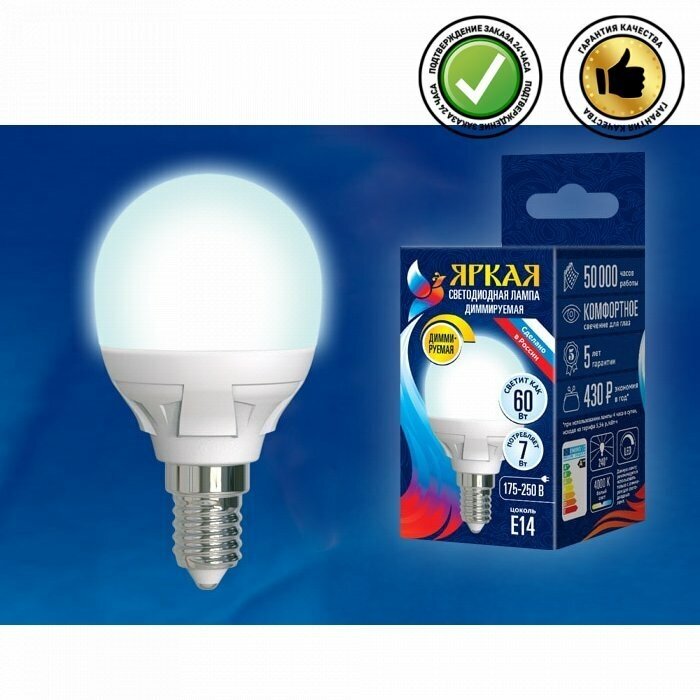 Uniel LED-G45 7W/4000K/E14/FR/DIM PLP01WH Лампа светодиодная, диммируемая. Форма «шар», матовая. Серия Яркая. Белый свет (4000K). Картон. ТМ Uniel.
