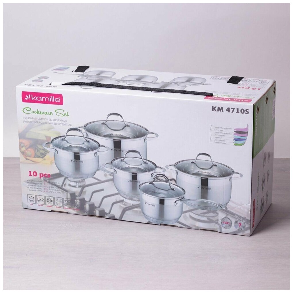 Лучшие цены. Набор кастрюль Kamille — это всегда вкусное и здоровое приготовление пищи. Кастрюли выполнены из качественной нержавеющей стали с применением современных технологий производства. Такие кастрюли имеют прекрасный внешний вид, оснащены 7-слойным капсульным дном и отличаются высокой прочностью и долговечностью в использовании. Набор кастрюль Kamille KM-4710S (10 предметов) Материал: нержавеющая сталь. Материал крышки: жаропрочное стекло. Количество предметов в наборе: 10. Комплектация: ковш с крышкой 1,8 л. Магазины в вашем городе.