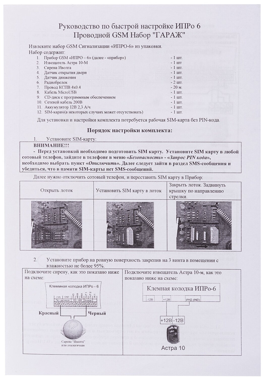 Лучшие цены. Готовый к установке комплект проводной GSM-сигнализации для гаража или склада, работает в неотапливаемых помещениях. SMS-оповещение о тревоге, удаленное управление через SMS. Мобильное приложение «ИПРо-6» для iPhone/Android. Управление внешними устройствами. Комплект предварительно настроен, осталось только задать номер телефона для оповещения (звонком на номер прибора). При необходимости более подробной настройки подключите прибор к компьютеру через USB-порт. ПО для Windows в комплекте. Магазины в вашем городе.