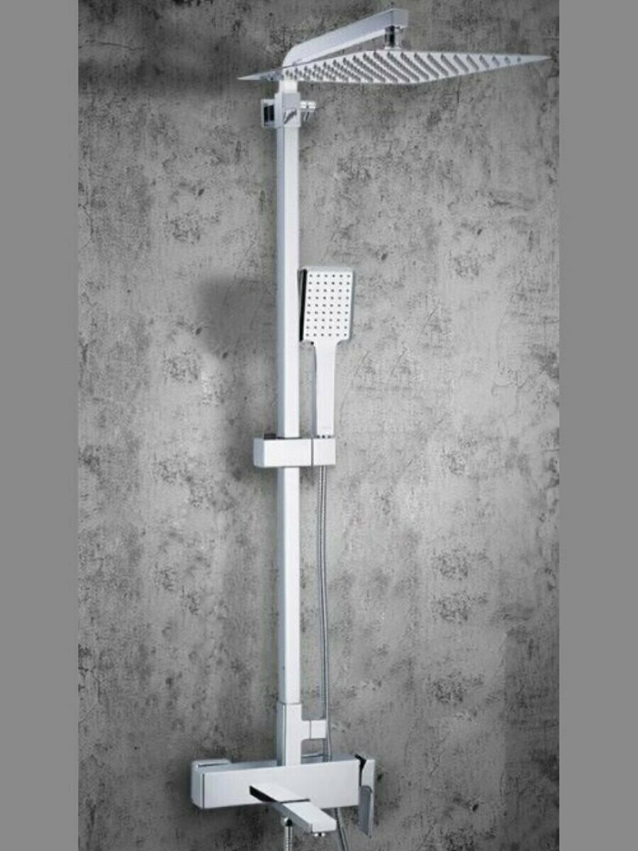 Лучшие цены. Общие характеристики Тип душевая стойка Материал стойки латунь Материал верхнего душа нержавеющая сталь Материал лейки абс-пластик Покрытие хром Особенности Количество режимов верхнего душа 1 Тропический дождь есть Форма верхнего душа квадратная Количество режимов лейки 1 Антиизвестковое покрытие есть Монтаж Способ монтажа настенный Присоединительный размер 1/2" S-образные эксцентрики есть Комплектация Смеситель однозахватный Излив для наполнения ванны есть Верхний душ есть Ручной душ (лейка + шланг). Магазины в вашем городе.