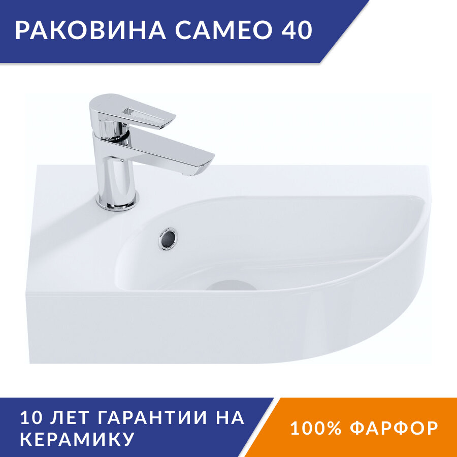Лучшие цены. Компактная угловая раковина с закругленными углами и плавной линией контура шириной 45 см выпускается в левостороннем и правостороннем вариантах. Раковина проста в установке, не требует дополнительного оборудования (пьедесталов, тумб). Долговечный материал устойчив к механическим повреждениям (сколам и царапинам) и выдерживает нагрузку до 150 кг Сверхпрочная безупречно гладкая глазурь Благодаря двум вариантам исполнения раковина CAMEO поможет оформить в едином стиле расположенные зеркально санузлы. Магазины в вашем городе.