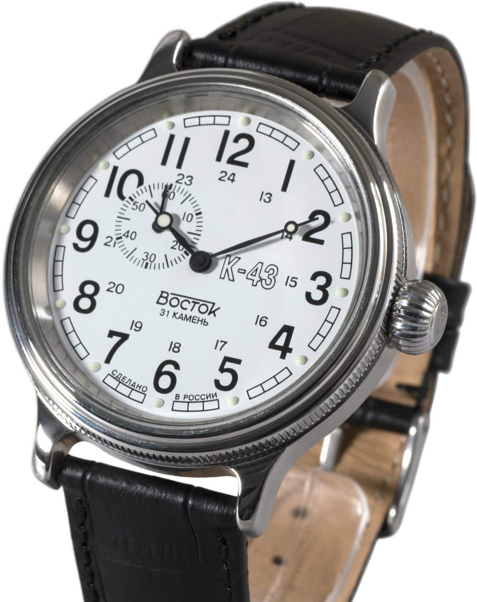 Лучшие цены. Мужские российские механические наручные часы Восток 540932 К-43 с автоподзаводом. Оригинальный дизайн циферблата. Пружинный механизм с точностью +60/- 20 сек в сутки. Отображение времени в часовом формате 12/24. Секундная стрелка вынесена на отдельный циферблат. В механизме рубиновых камней - 31. Запас хода 31 час. Противоударное устройство оси баланса от небольших механических воздействий. Стрелки часов покрыты безопасным люминесцентным покрытием, которое светится в темноте. Магазины в вашем городе.